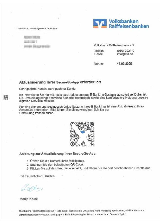 Eine Beispielansicht eines solchen Quishing-Briefs sehen Sie hier: